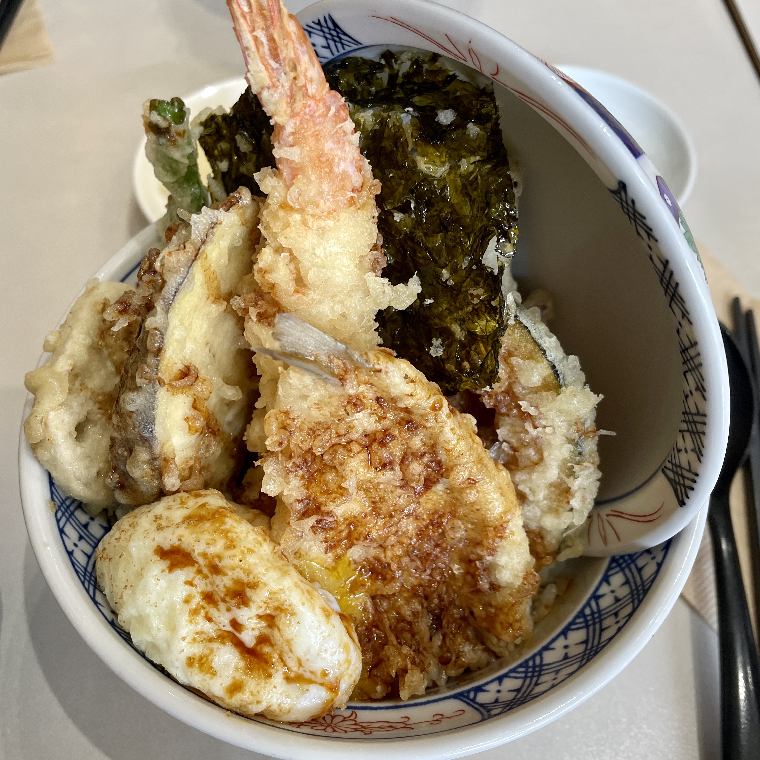 보리멸, 오징어, 장어가 추가로 들어있는 텐동이 있어요.