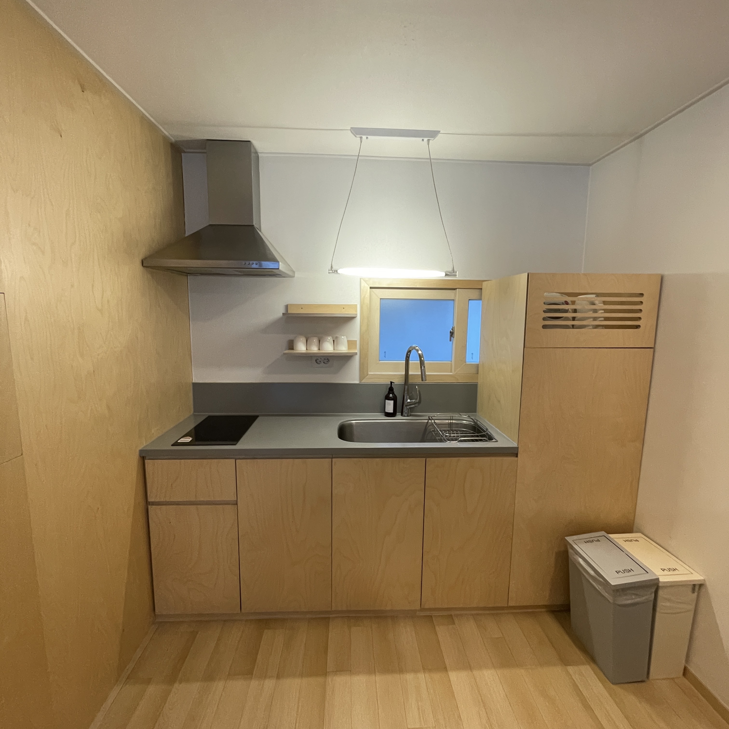 인덕션,개수대, 전기밥솥, 커피포트가 있고