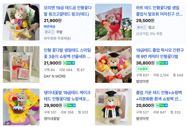 네이버 검색창에 '테디 꽃다발'이라고 검색하면